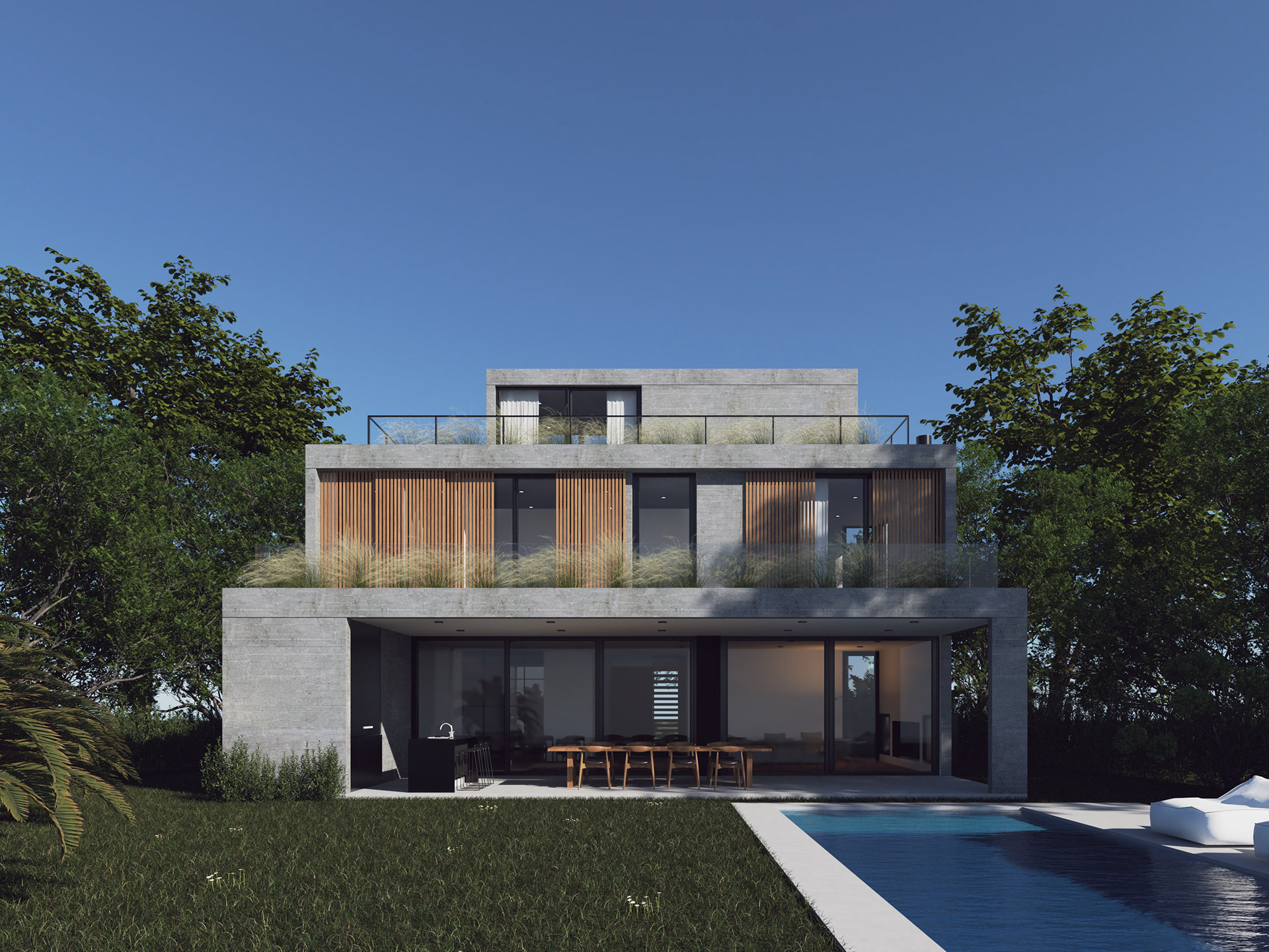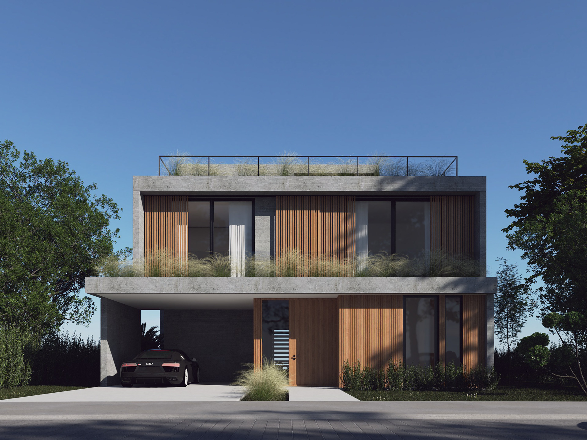 The project is conceived through a sober, contemporary architectural approach, where exposed concrete defines the home’s primary identity, providing solidity, character, and a strong material presence. This materiality is complemented by timber brise-soleil, which introduce warmth and texture, establishing a balance between robustness and domestic sensitivity.