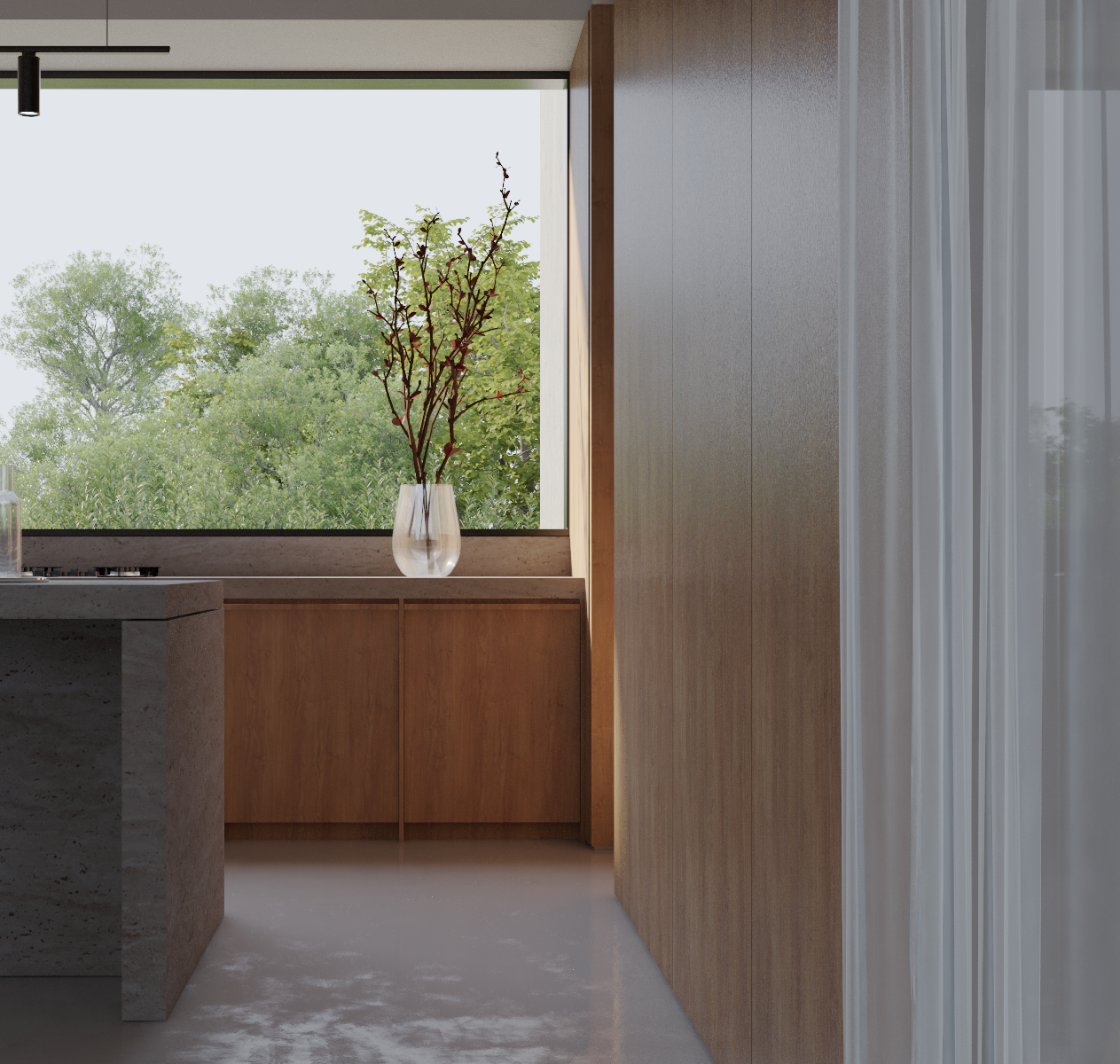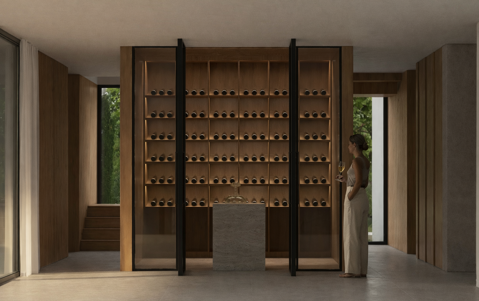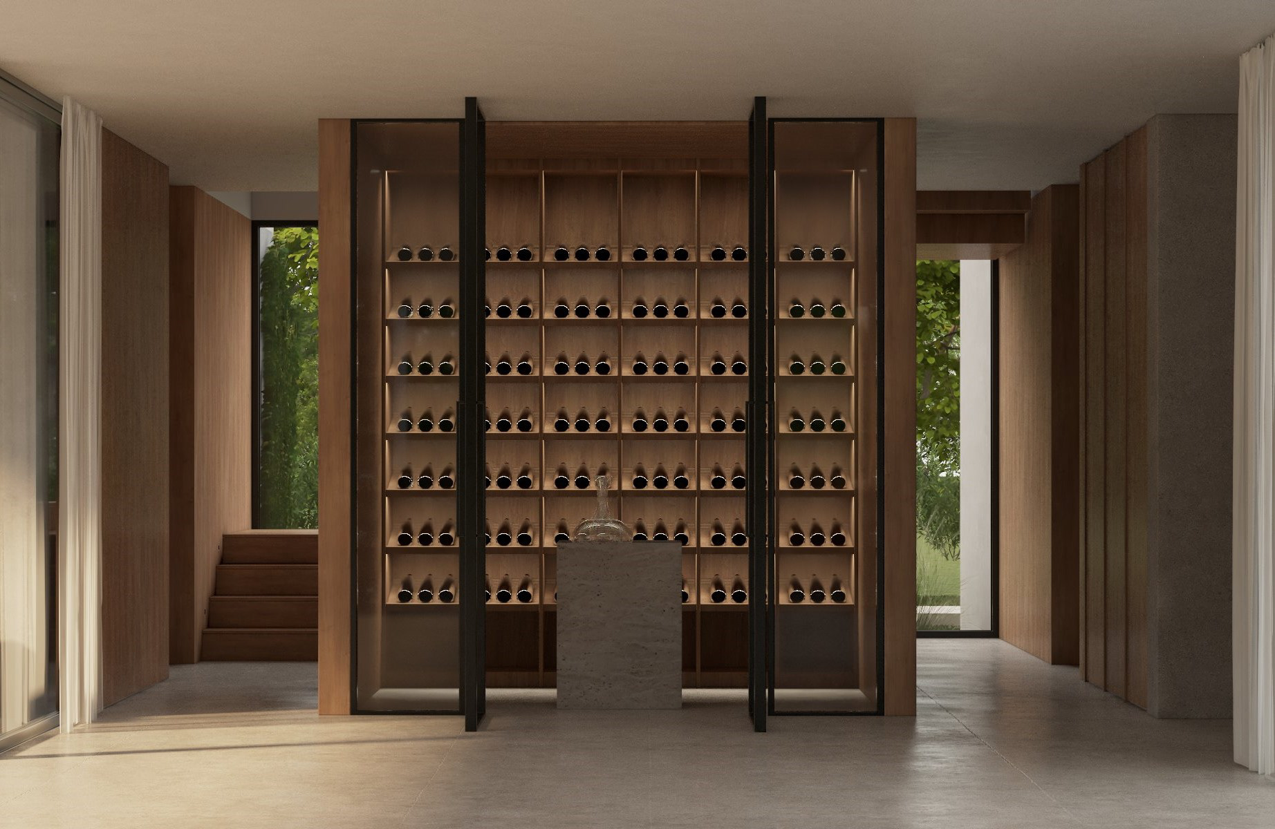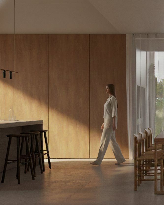 The project is structured through the contrast between exposed concrete and warm timber, establishing a dialogue between weight and lightness, permanence and warmth.