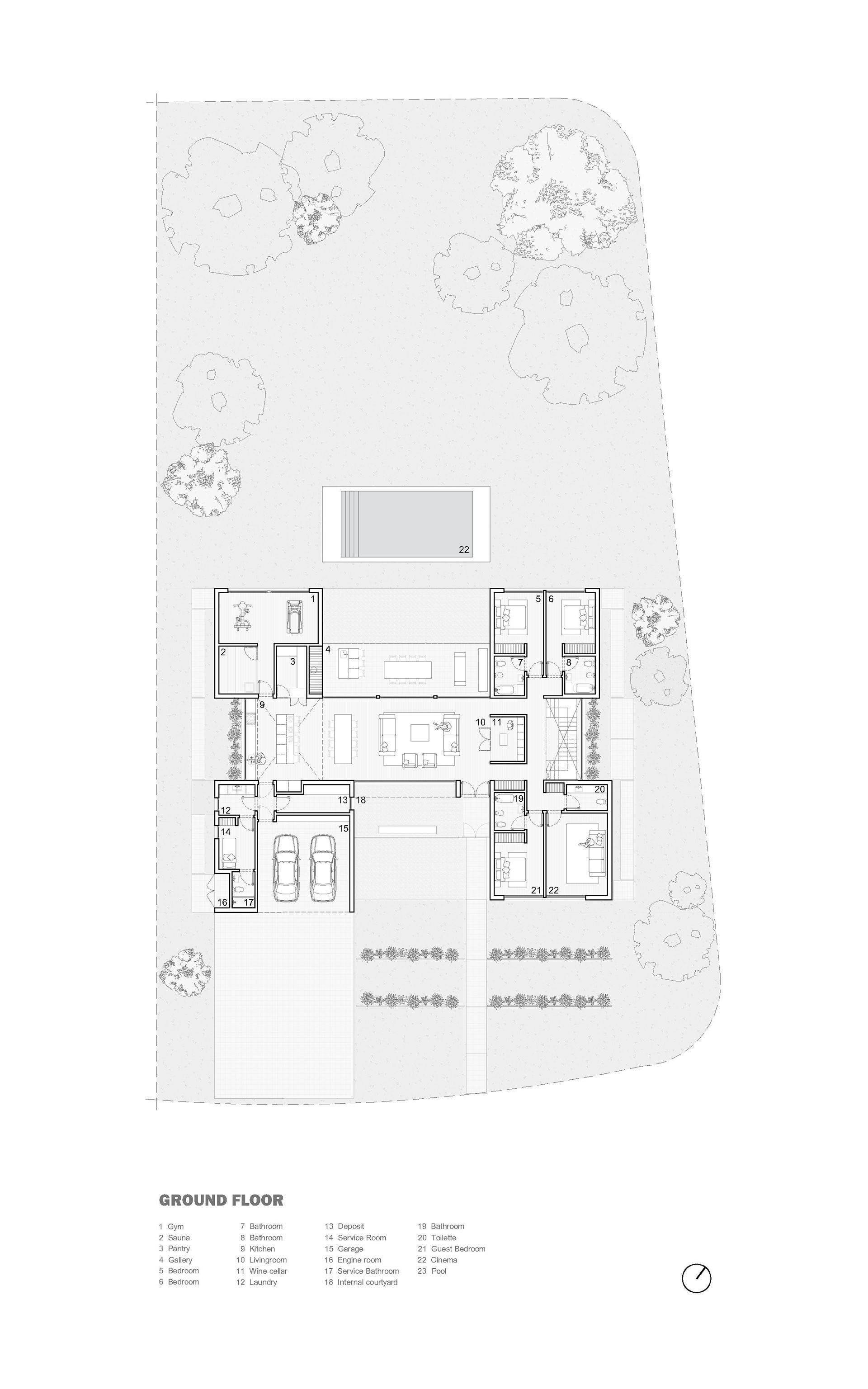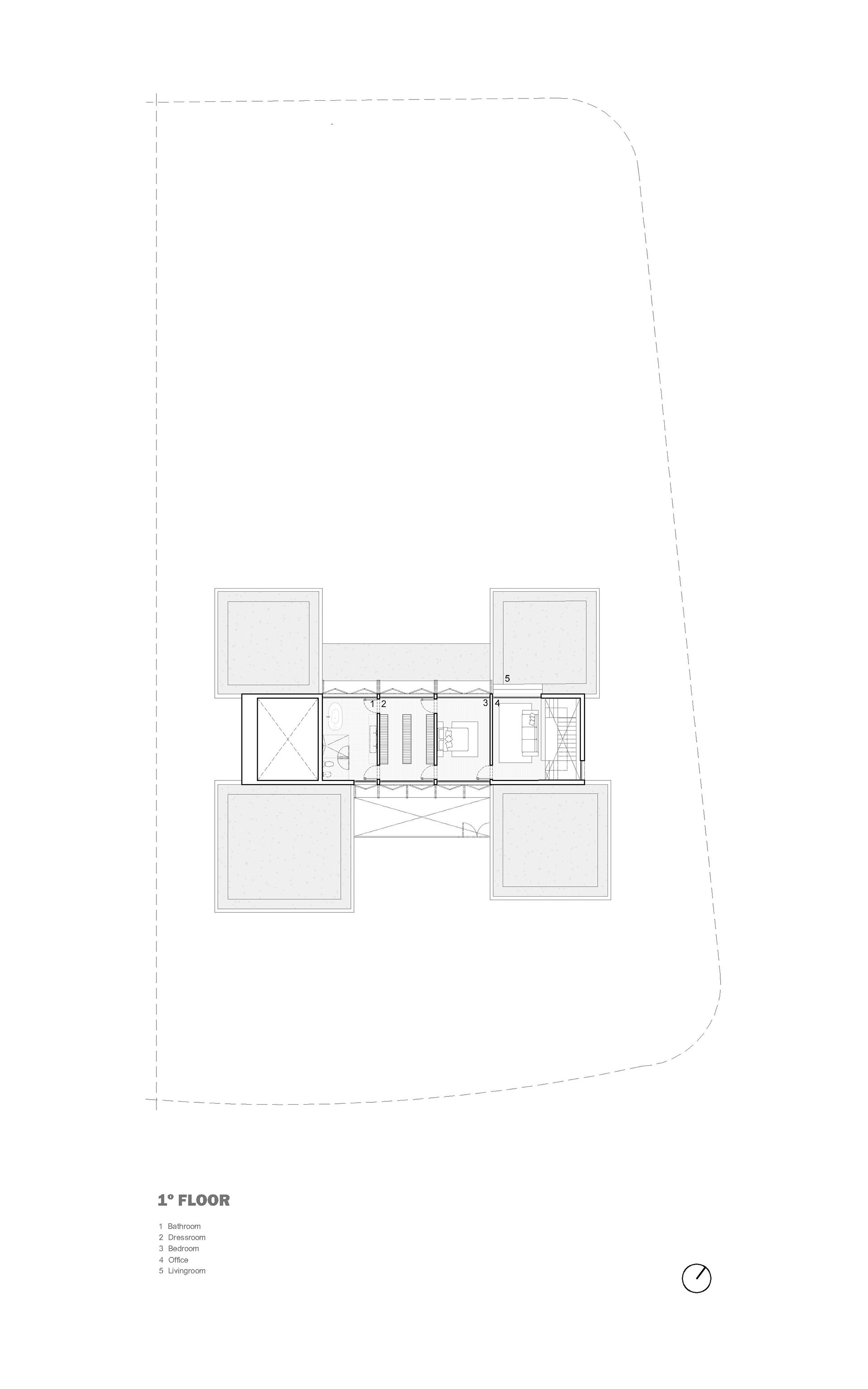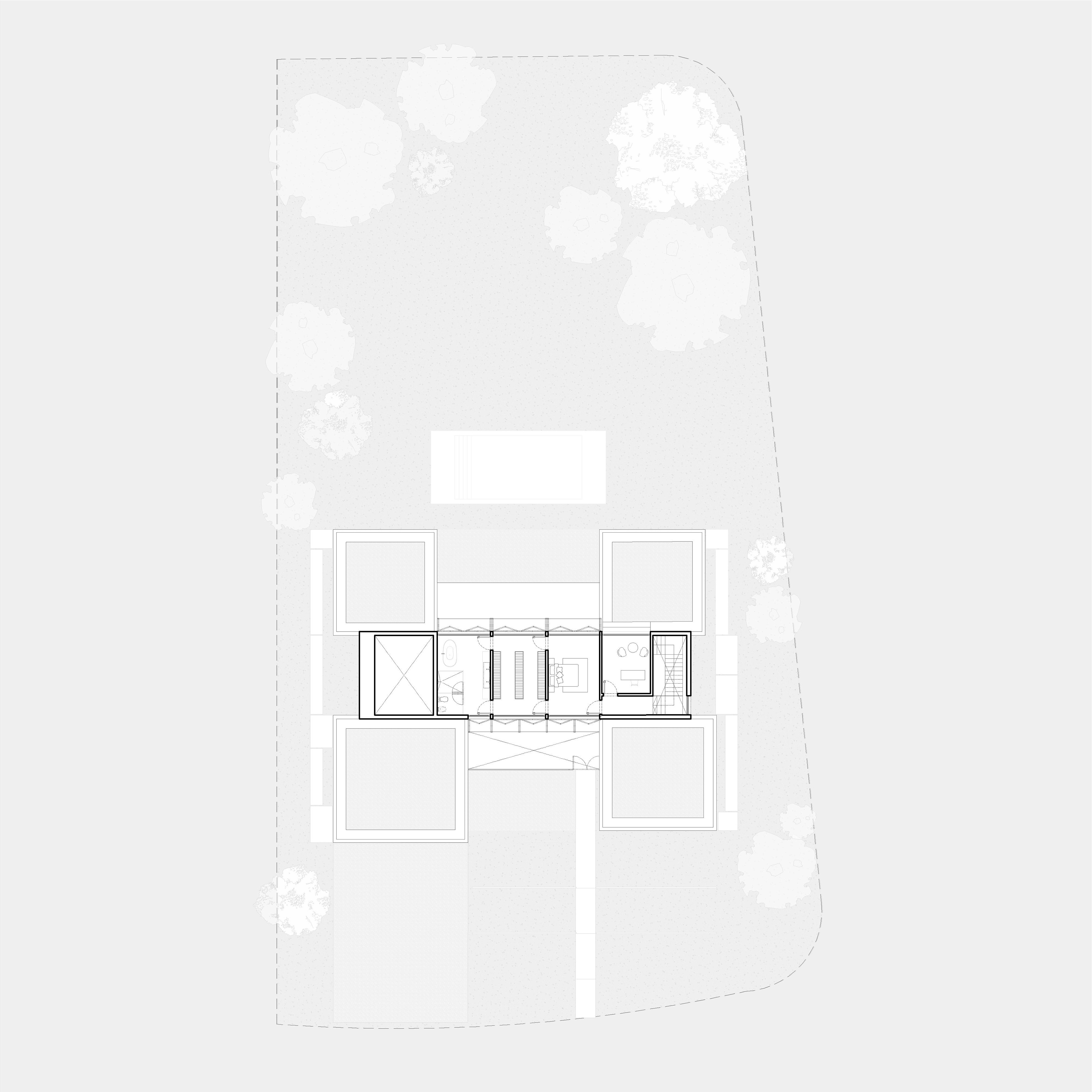The ground floor is conceived as a concrete base that anchors the house to the site, while the upper level is developed entirely in wood, creating a lighter and more intimate domestic scale. Large openings dissolve the boundary between interior and exterior, allowing vegetation, light and golf views to become part of the spatial experience.
